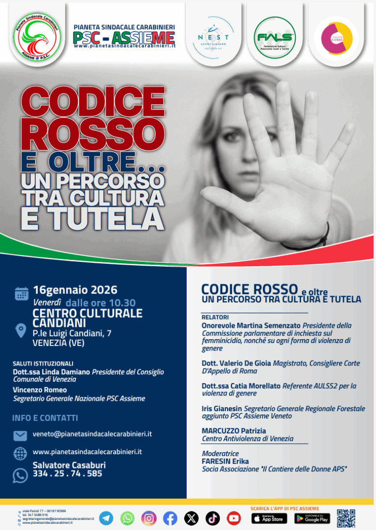 L’evento, organizzato da Pianeta Sindacale Carabinieri PSC-Assieme, rappresenta un momento di riflessione profonda sulle dinamiche della violenza di genere e sugli strumenti normativi a disposizione per contrastarla.