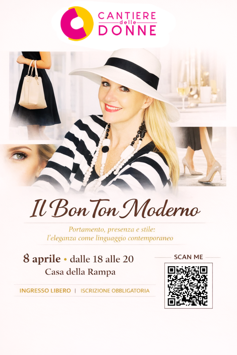 Mercoledì 8 aprile, dalle 18.00 alle 20.00, alla Casa della Rampa – III piano, il Cantiere delle Donne propone un incontro dedicato al Bon Ton Moderno, un workshop esperienziale per riscoprire il valore del portamento, dell’immagine e del linguaggio non verbale nei contesti professionali e personali.
